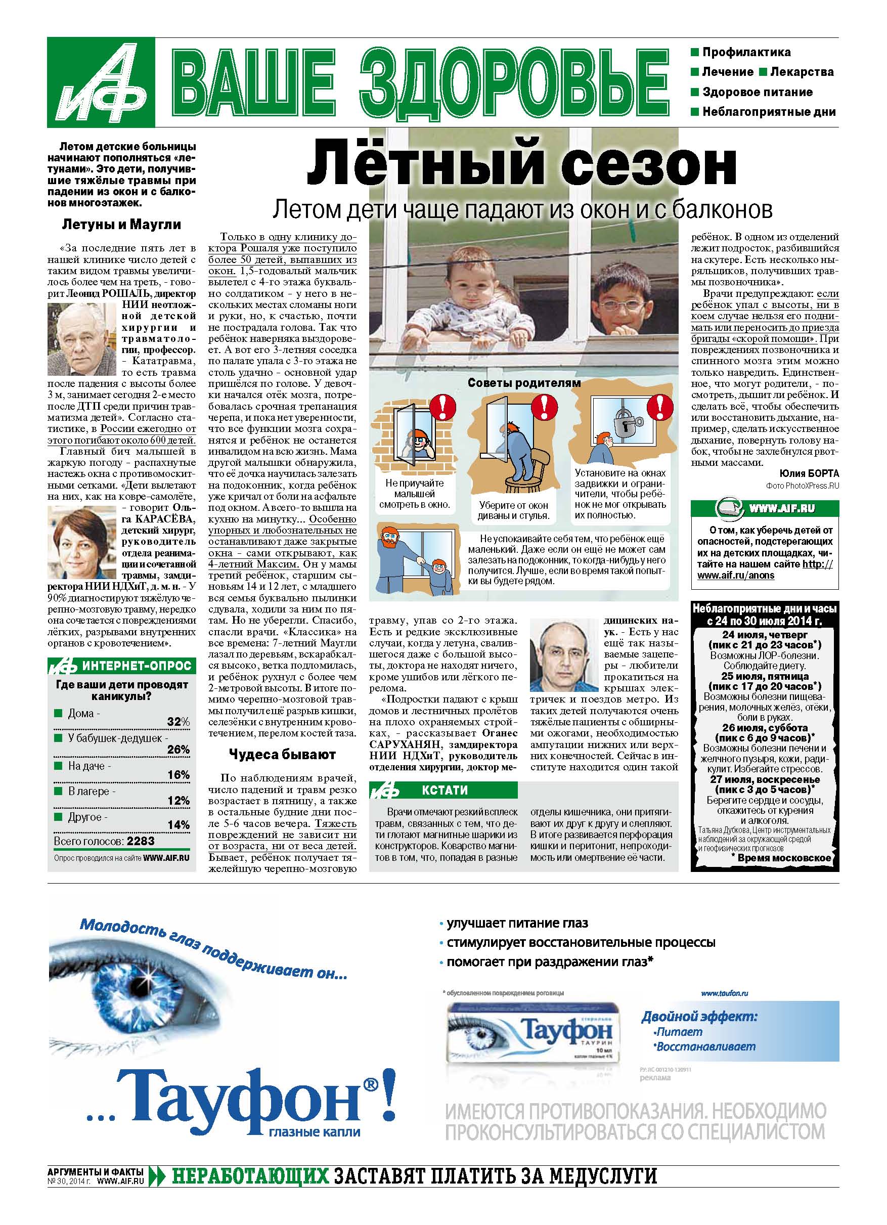 На страницах этой постоянной рубрики читатель найдет информацию о различных заболеваниях и методах их лечения, о здоровом питании и образе жизни, о новинках в медицине и фармакологии, мнения экспертов и советы практикующих врачей. По итогам опросов call-центра АиФ статьи именно этого раздела чаще всего попадают в перечень наиболее рейтинговых. Ведь здоровье и семья для читателей еженедельника – основополагающие ценности жизни.